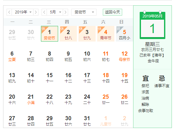 一、2019年5月1日至4日放假調(diào)休,共4天。4月28日(星期日)、5月5日(星期日)上班。