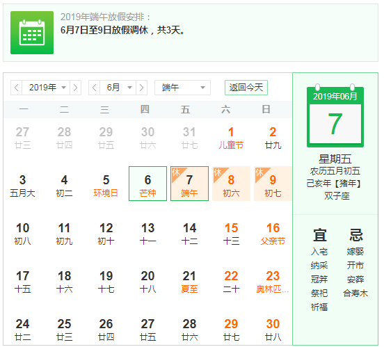 端午節(jié)假期將至,首先向全體員工致以節(jié)日的問(wèn)候,為了度過(guò)歡樂(lè)、祥和、平安的節(jié)日,2019年端午節(jié)的放假時(shí)間:2019年6月7日至6月9日放假公休,共3天。6月7日(星期五,農(nóng)歷端午節(jié)當(dāng)日)為國(guó)家法定節(jié)假日,6月8日(星期六)公休,6月9日(星期日)補(bǔ)休。